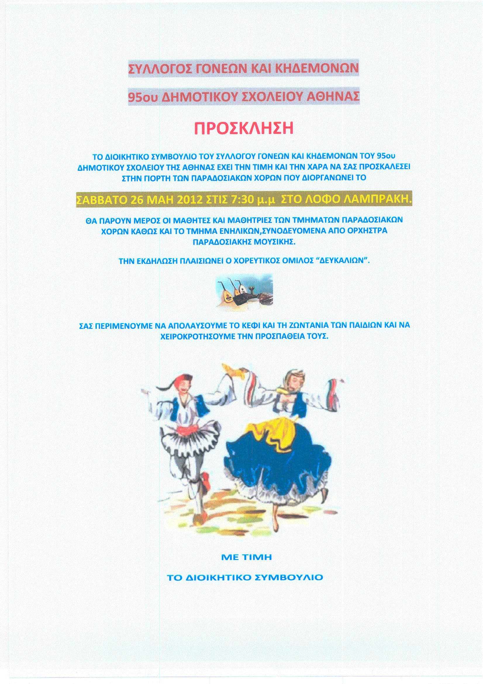 Όπως πέρυσι -όπου πήγα και το ευχαριστήθηκα πολύ- έτσι και φέτος το 95ο Δημοτικό Σχολείο της Αθήνας διοργανώνει γιορτή παραδοσιακών χορών. Πατήστε κλικ στην παρακάτω πρόσκληση.