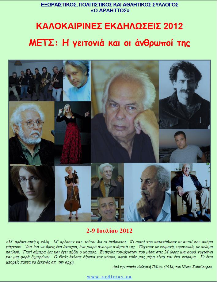 ο σύλλογος “Ο ΑΡΔΗΤΤΟΣ” έστειλε το παρακάτω πρόγραμμα για τις καλοκαιρινές εκδηλώσεις που διοργανώνει. Από την πλευρά μου θέλω να ευχαριστήσω πολύ το Δήμο Αθηναίων, τον κ. Αντωνόπουλο (αντιδήμαρχο πρασίνου), τον κ. Λιβάνιο (Γεν.Γραμματέα) και την υπηρεσία Ηλεκτρολογικού.