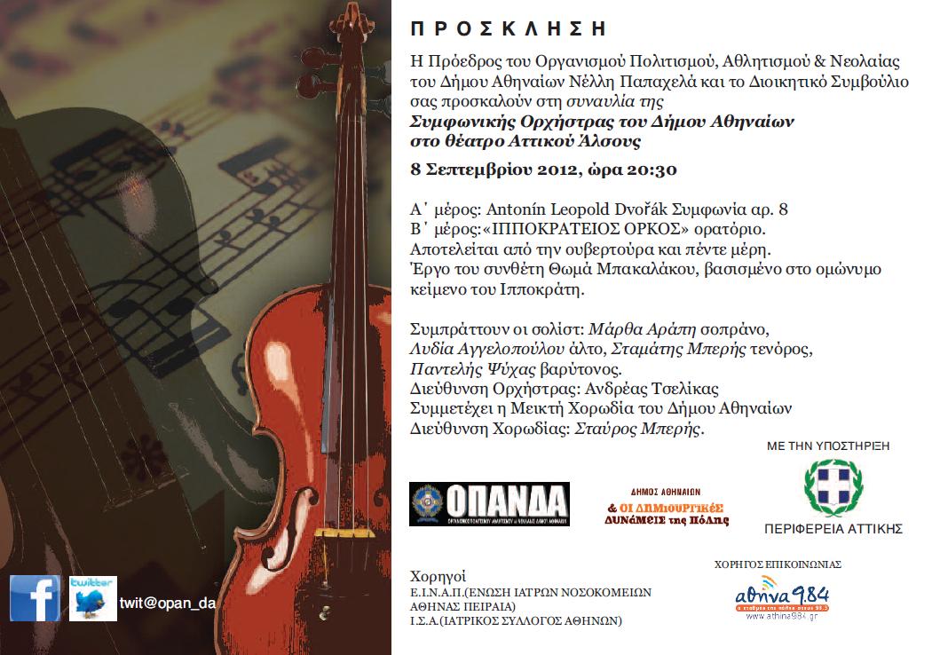 ΠΡΟΣΚΛΗΣΗ Ο Δήμος Αθηναίων μας προσκαλεί σε συναυλία (πατήστε κλικ στην παρακάτω εικόνα για να δείτε την πρόσκληση) στο θέατρο του Αττικού Άλσους, στις 8 Σεπτεμβρίου 2012, ώρα 20:30. Share this: Click to share on LinkedIn (Opens in new window) LinkedIn Click to share on Facebook (Opens in new window) Facebook Like Loading... Related This entry was posted in Γενικά. Bookmark the permalink.