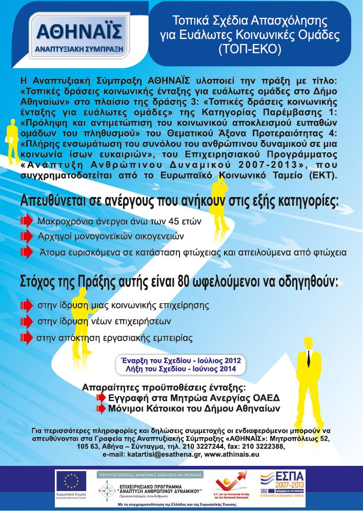 Στο πλαίσιο της υλοποίησης της πράξης με τίτλο «Τοπικές δράσεις κοινωνικής ένταξης για ευάλωτες ομάδες στο Δήμο Αθηναίων» στο πλαίσιο της δράσης 3: «Τοπικές δράσεις κοινωνικής ένταξης για ευάλωτες ομάδες» της Κατηγορίας Παρέμβασης 1: «Πρόληψη και αντιμετώπιση του κοινωνικού αποκλεισμού ευπαθών ομάδων του πληθυσμού» του Θεματικού Άξονα Προτεραιότητας 4: «Πλήρης ενσωμάτωση του συνόλου του ανθρώπινου δυναμικού σε μια κοινωνία ίσων ευκαιριών», του Επιχειρησιακού Προγράμματος «Ανάπτυξη Ανθρώπινου Δυναμικού» 2007-2013» που συγχρηματοδοτείται από το Ευρωπαϊκό Κοινωνικό Ταμείο (ΕΚΤ).