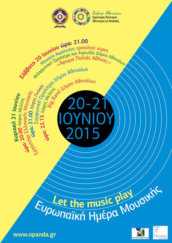 Ο Οργανισμός Πολιτισμού Αθλητισμού και Νεολαίας του Δήμου Αθηναίων γιορτάζει την Ευρωπαϊκή Ημέρα Μουσικής με ένα διήμερο μουσικών εκδηλώσεων, στο οποίο η Φιλαρμονική Ορχήστρα Πνευστών, η Χορωδία, η Συμφωνική Ορχήστρα, η Big Band και