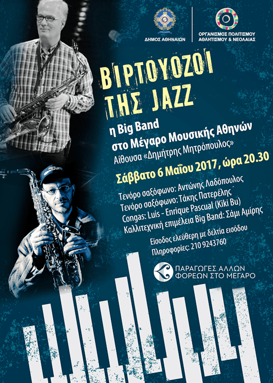 Η BIG BAND ΤΟΥ ΔΗΜΟΥ ΑΘΗΝΑΙΩΝ ΚΑΙ ΒΙΡΤΟΥΟΖΟΙ ΤΗΣ JAZZ ΣΤΟ ΜΕΓΑΡΟ ΜΟΥΣΙΚΗΣ Είσοδος ελεύθερη με δελτία εισόδου, πληροφορίες : 210-9243760 Share this: Share on LinkedIn (Opens in new window) LinkedIn Share on Facebook (Opens in new window) Facebook Like Loading... Related This entry was posted in Εκδηλώσεις. Bookmark the permalink.