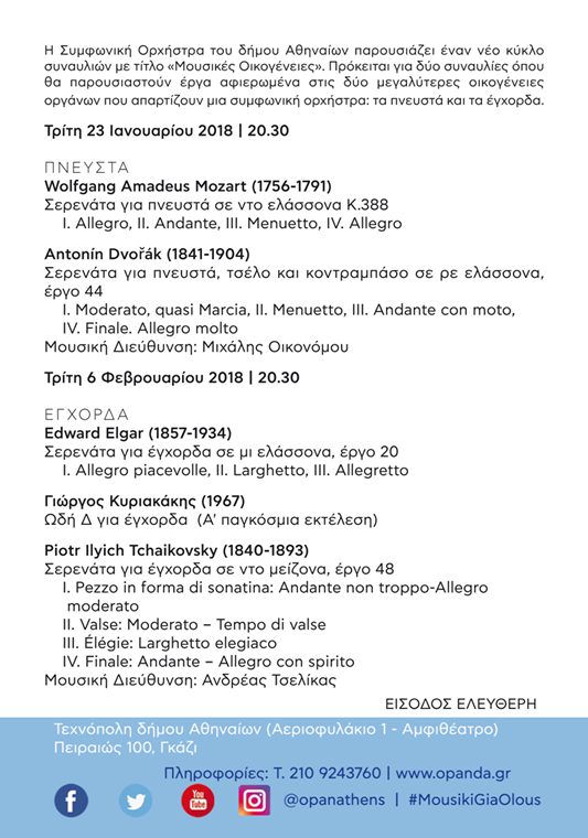 ΜΟΥΣΙΚΕΣ ΟΙΚΟΓΕΝΕΙΕΣ Η Συμφωνική Ορχήστρα του Δήμου Αθηναίων παρουσιάζει έναν νέο κύκλο συναυλιών όπου παρουσιάζονται έργα από αφιερωμένα στις δύο μεγαλύτερες οικογένειες οργάνων που απαρτίζουν μια συμφωνική ορχήστρα: τα πνευστά και τα έγχορδα. Share this: Click to share on LinkedIn (Opens in new window) LinkedIn Click to share on Facebook (Opens in new window) Facebook Like Loading... Related This entry was posted in Εκδηλώσεις. Bookmark the permalink.