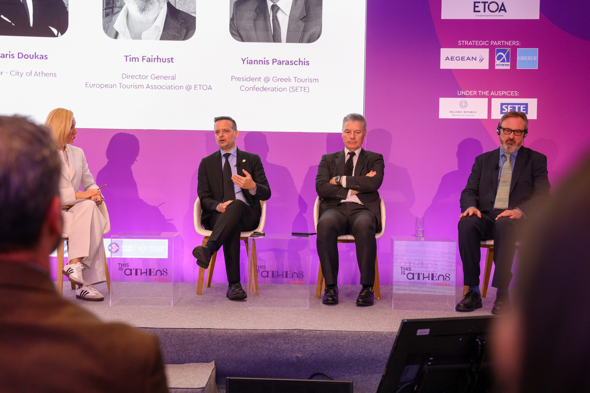 Από την πλευρά του, ο Πρόεδρος του Συνδέσμου Ελληνικών Τουριστικών Επιχειρήσεων (ΣΕΤΕ) και Διευθύνων Σύμβουλος του Διεθνούς Αεροδρομίου Αθηνών (ΔΑΑ), Ιωάννης Παράσχης, στην ομιλία του, μεταξύ άλλων, σημείωσε: «H Αθήνα διανύει τα τελευταία χρόνια μια εξαιρετικά δυναμική περίοδο τουριστικής ανάπτυξης, έχοντας κατακτήσει πλέον μια από τις κορυφαίες θέσεις ανάμεσα στους ευρωπαϊκούς αστικούς προορισμούς. Καθώς καλούμαστε να αντιμετωπίσουμε ένα ευρύ φάσμα προκλήσεων, με έμφαση στη διαχείριση και στην ενίσχυση του βιώσιμου αποτυπώματος της πόλης μας, η αξιοποίηση των συνεργασιών αποτελεί έναν κρίσιμο και καθοριστικό παράγοντα. Η σημαντική πρωτοβουλία του Δήμου Αθηναίων, This is Athens – Agora εμπεριέχει την έννοια του διαλόγου και της συνεργασίας και συγκεκριμένα της αυτοδιοίκησης και του ιδιωτικού τομέα, με στόχο τη συντονισμένη προσέγγιση σε θέματα τουριστικής ανάπτυξης. Αποτελεί χρέος όλων όσοι δραστηριοποιούμαστε στους ζωτικούς κλάδους του τουρισμού και του ταξιδιού να διαφυλάξουμε και να ενισχύσουμε όσα έχουμε πετύχει, έχοντας τώρα μια σημαντική ευκαιρία να συνεχίσουμε να επενδύουμε στην ποιότητα, τη βιωσιμότητα και την εξωστρέφεια για το επόμενο σημαντικό κεφάλαιο της εξέλιξης και της αναβάθμισης της πόλης μας ως κορυφαίου τουριστικού προορισμού».
