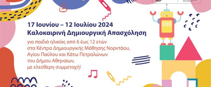 Τα Κέντρα Δημιουργικής Μάθησης Νορντάου και Αγίου Παύλου, καθώς και για πρώτη φορά το Κέντρο Δημιουργικής Κάτω Πετραλώνων υποδέχονται τα παιδιά ηλικίας από 6 έως 12 ετών (που έχουν γεννηθεί από το 2012 έως το 2017), από 17 Ιουνίου έως 12 Ιουλίου 2024, για να αξιοποιήσουν εποικοδομητικά τον ελεύθερό τους χρόνο αλλά και να διασκεδάσουν στο πρόγραμμα Δημιουργικής Απασχόλησης που προσφέρει δωρεάν και αυτό το καλοκαίρι ο Δήμος Αθηναίων.
