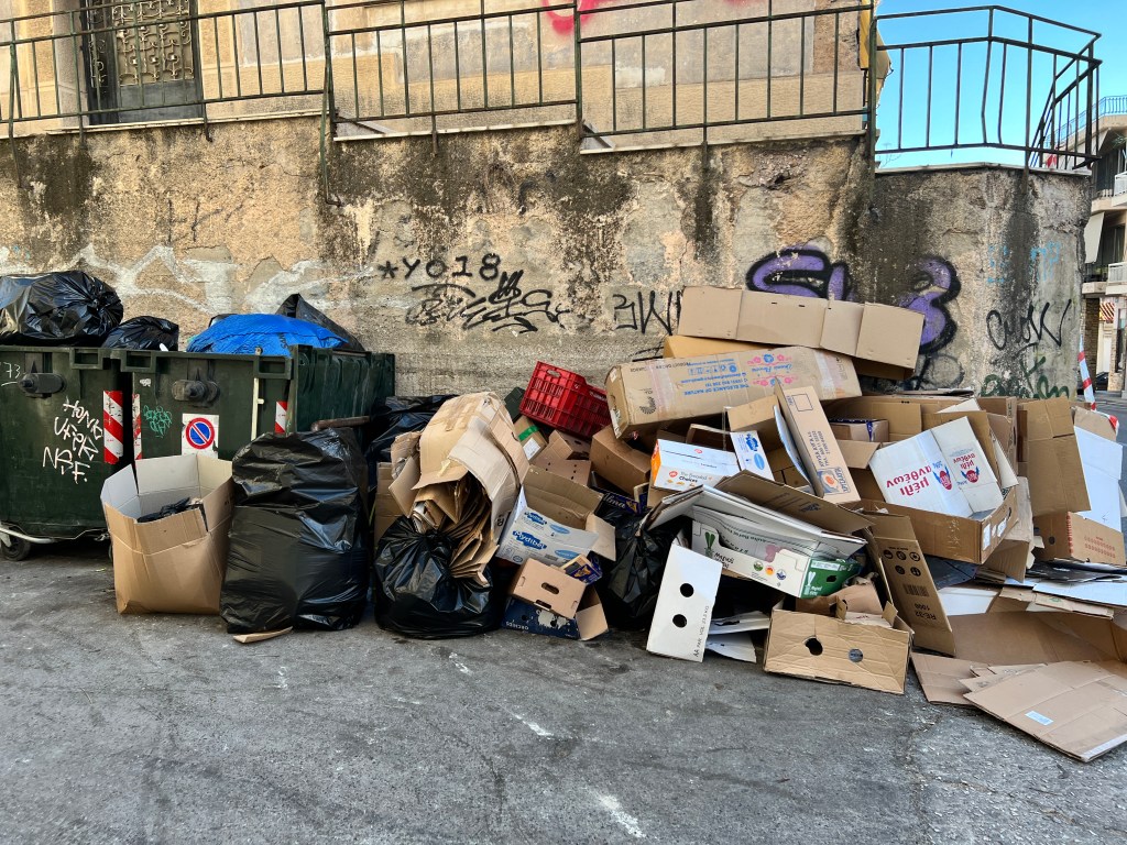 (Φωτό από σημεία της 2ης Κοινότητας. Η πρώτη φωτογραφία έχει τραβηχθεί στην οδό Φιλολάου στο Παγκράτι, κοντά σε σπίτια, επιχειρήσεις οπωροκηπευτικών και αρτοποιείων, και η δεύτερη στη συμβολή των οδών Λεωφόρο Καρέα και Τριβωνιανού όπου τα κουτιά από τις συσκευασίες προϊόντων τροφίμων βρίσκονται στο σημείο εδώ και δύο ημέρες)
