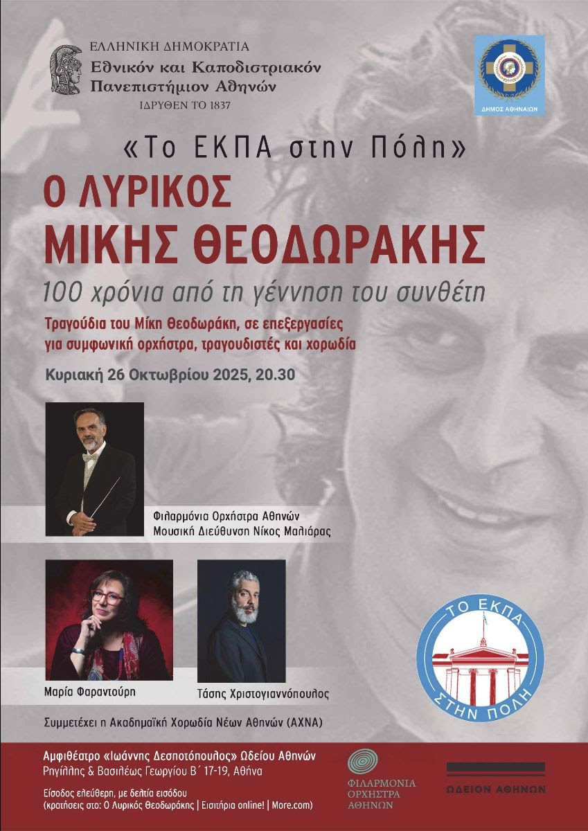 Με δύο επετειακές συναυλίες για τη συμπλήρωση των 100 χρόνων από τη γέννηση του Μίκη Θεοδωράκη και του Μάνου Χατζιδάκι, συνεχίζονται μέχρι τον Δεκέμβριο, οι επιμορφωτικές, πολιτιστικές και καλλιτεχνικές δράσεις, που πραγματοποιούν από κοινού ο Δήμος Αθηναίων, το Εθνικό και το Καποδιστριακό Πανεπιστήμιο Αθηνών, υπό τον τίτλο «Το ΕΚΠΑ στην Πόλη».