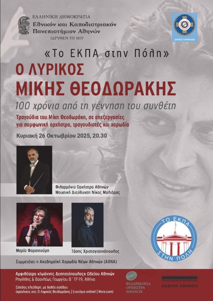 Η επετειακή συναυλία για τον Μίκη Θεοδωράκη με τη Φιλαρμόνια Ορχήστρα Αθηνών θα πραγματοποιηθεί την Κυριακή 26 Οκτωβρίου 2025, στις 20:30, στο Αμφιθέατρο «Ιωάννης Δεσποτόπουλος» του Ωδείου Αθηνών (Ρηγίλλης & Βασιλέως Γεωργίου Β΄ 17-19, Αθήνα).
